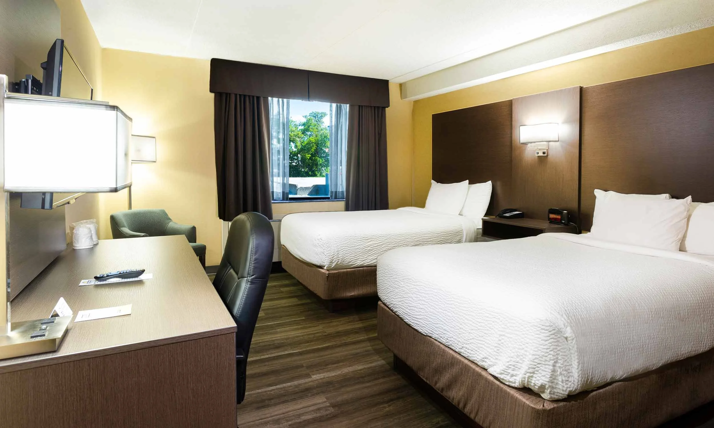 This room includes two double beds, grab & go breakfast, FREE Wi-Fi, sitting area with chairs, desk, coffee maker, iron and ironing board, clock radio, satellite TV, and access to our outdoor pool (subject to seasonal availability). All guestrooms at The Days Inn Fallsview are non smoking.